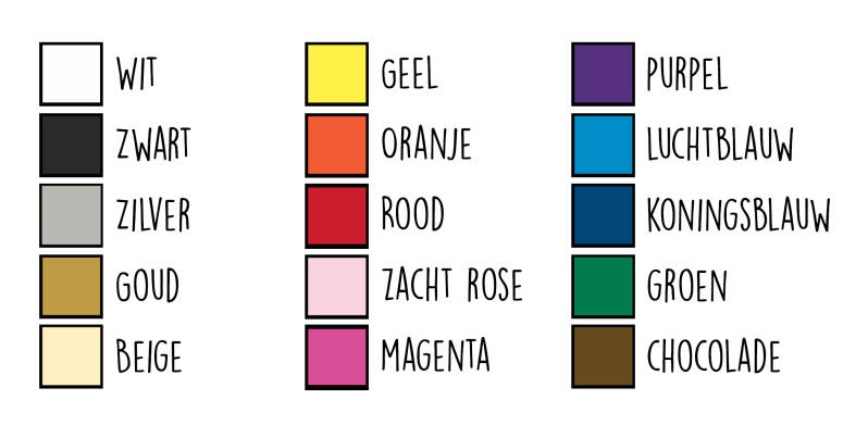 Specificeer je kleurkeuze bij opmerkingen op de bestelpagina.