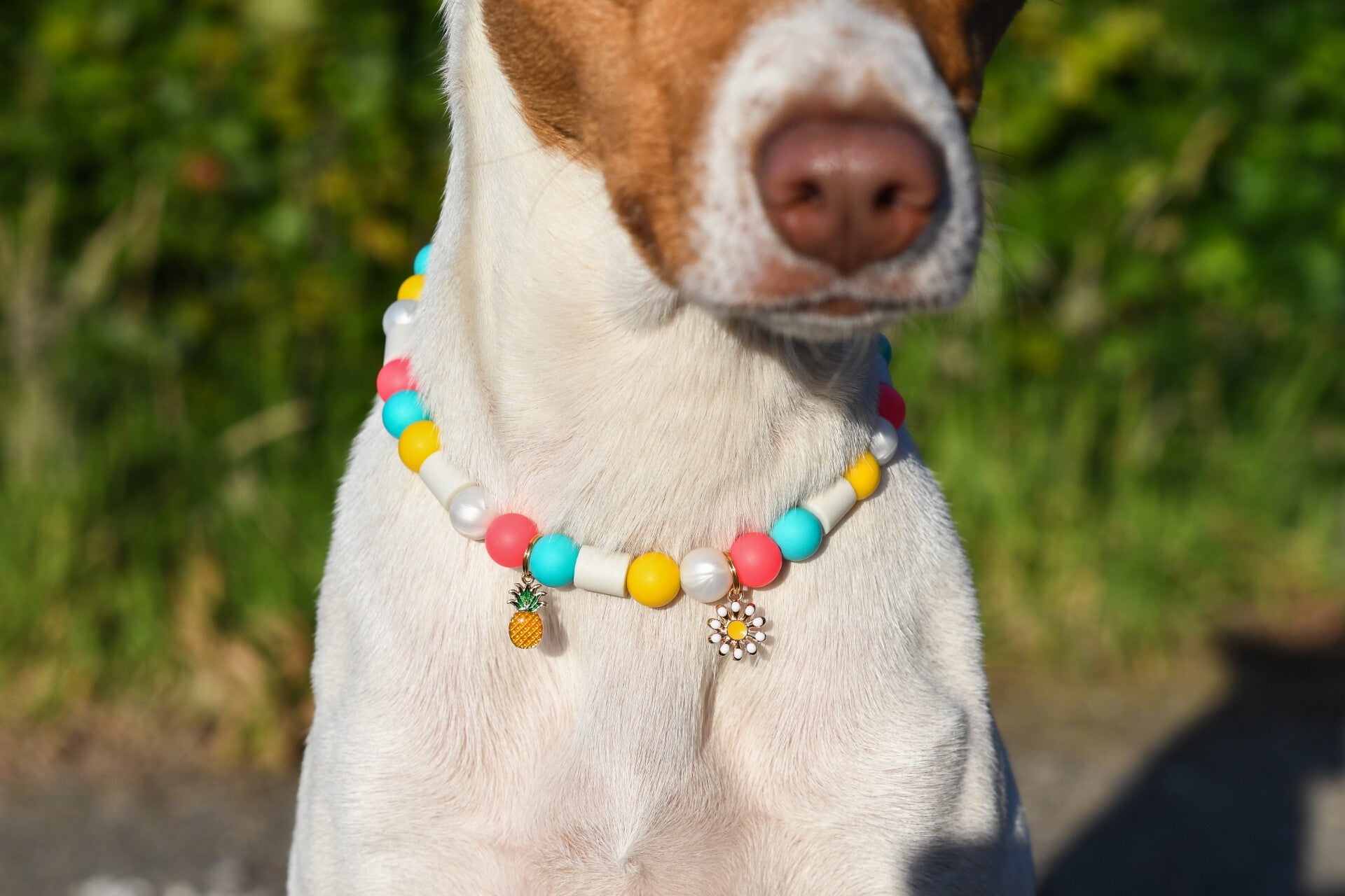 Een tekenbandje wordt gemaakt met een schuif-sluiting. Hierdoor kan het 10 cm vergroot worden om het zo gemakkelijk over de kop van je hond te schuiven!
