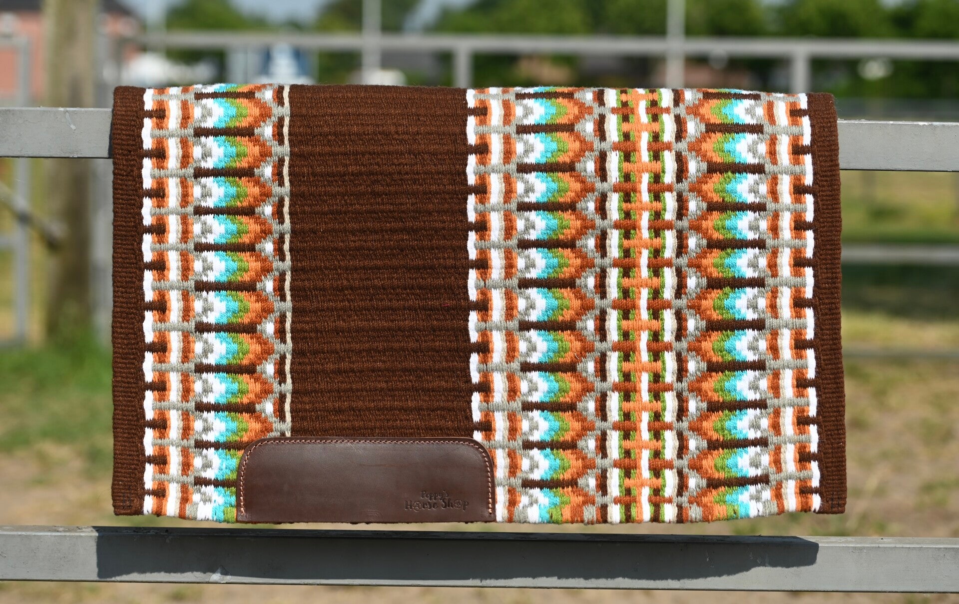 Showblanket gemaakt van 100% wol. Afgewerkt met een lederen stuk waar de singel komt.