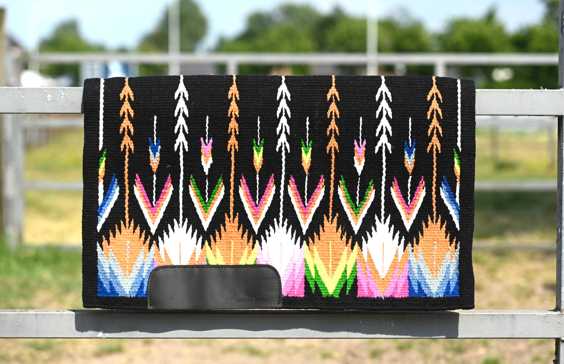 Showblanket gemaakt van 100% wol. Afgewerkt met een lederen stuk waar de singel komt.
