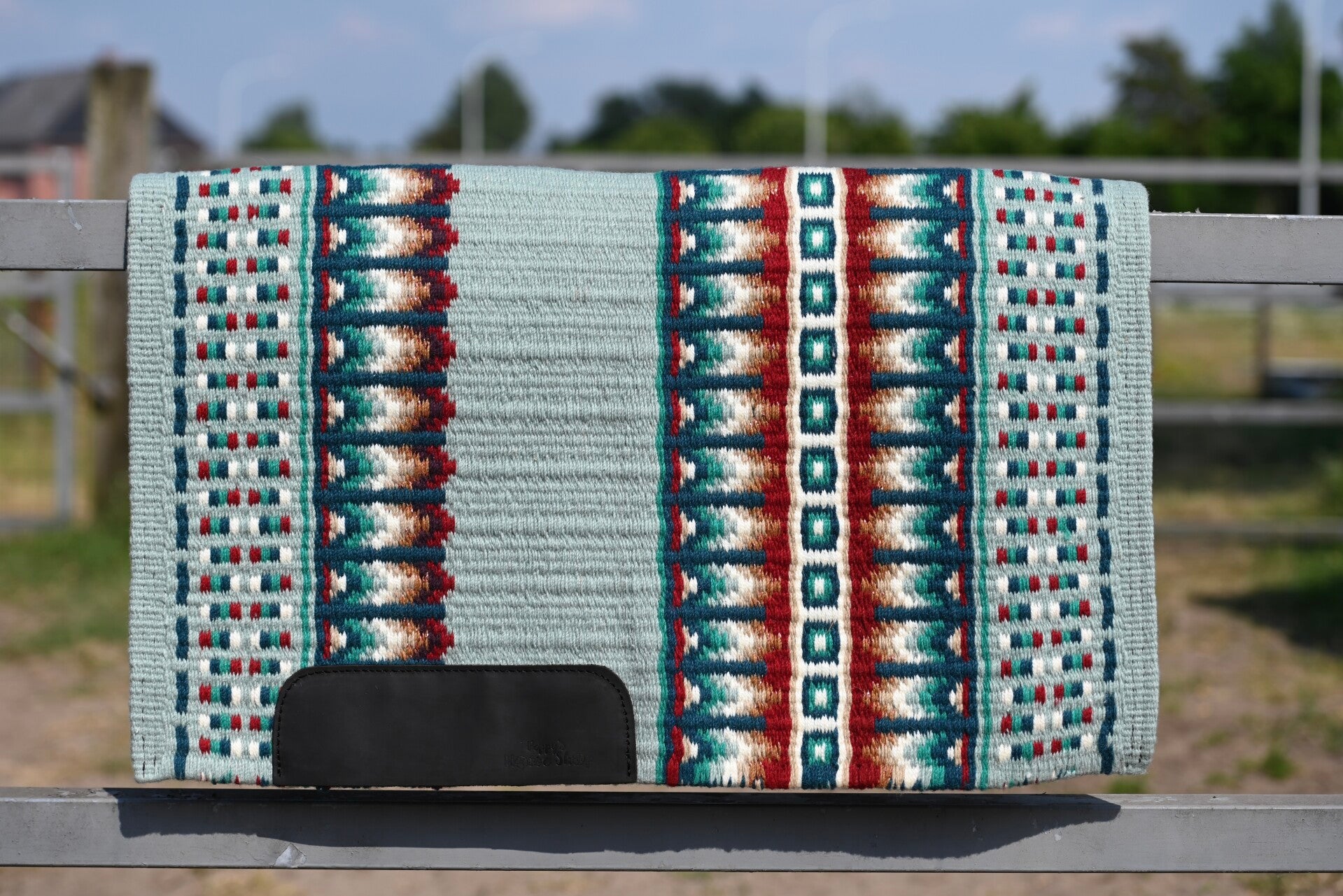 Showblanket gemaakt van 100% wol. Afgewerkt met een lederen stuk waar de singel komt.