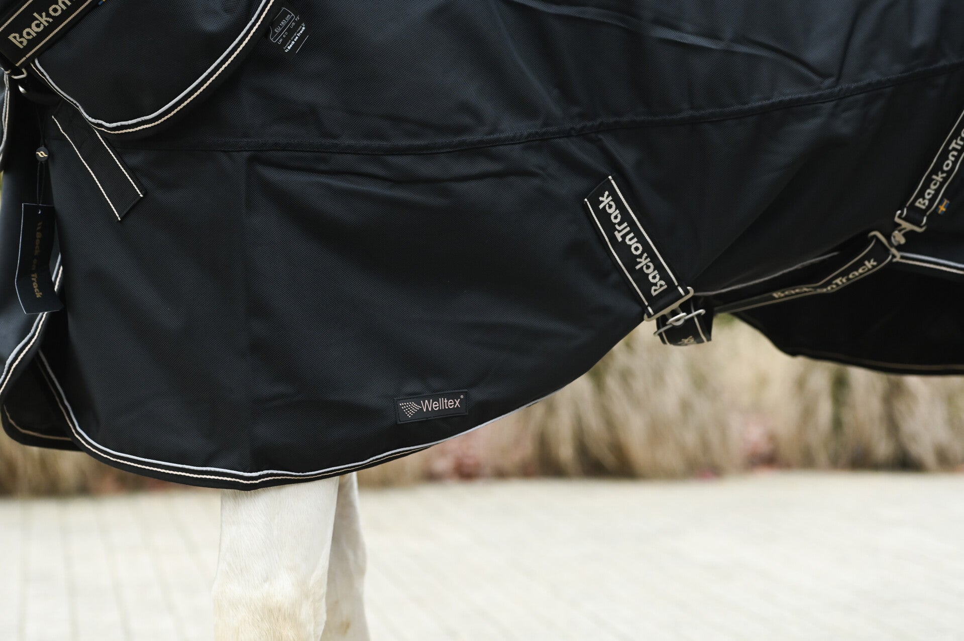 Luxe Zwart van kleur, zowel de deken als de nek zijn netjes afgewerkt met reflectie biesjes, voor een goede zichtbaarheid en veiligheid.