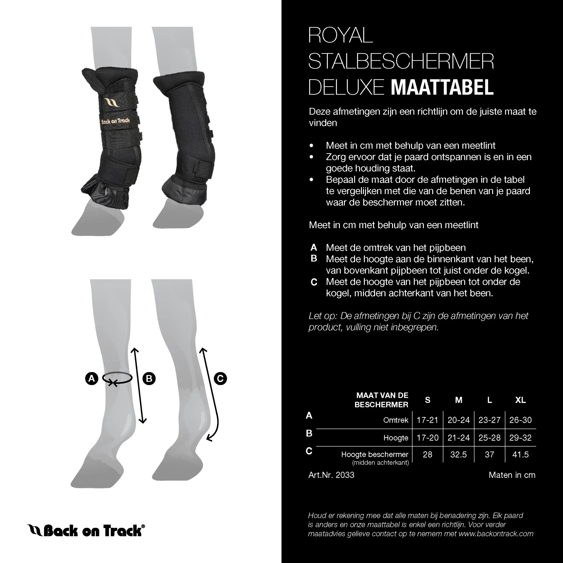 De Royal Stalbeschermers Deluxe zijn eenvoudig en gemakkelijk te gebruiken, een uitstekend alternatief voor het bandageren van de benen. Vier stevige klittenbandsluitingen zorgen voor een goede pasvorm, zowel in de stal als tijdens transport. De buitenschaal en het binnenkussen zijn aan elkaar bevestigd met klittenband, wat het wassen en drogen vergemakkelijkt. Het kussen heeft onze bekende Welltex®-technologie, die kan helpen de bloedcirculatie te stimuleren door middel van infrarood-energie. Het effect kan helpen om het ongemak te verlichten voor paarden die problemen hebben met ligamenten, pezen en gewrichten. Onze klanten maken vaak gebruik van de Stalbeschermers om blessures te voorkomen en het herstel te ondersteunen van bijvoorbeeld ontstekingen, zwellingen of het ongemak bij artrose te verlichten.
