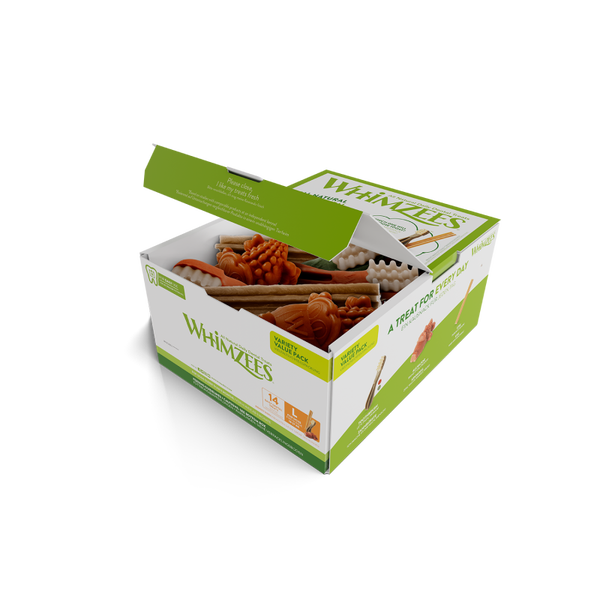 Deze vegetarische, puur natuurlijke snacks zijn in hun geheel eetbaar, licht verteerbaar en helpen de oppervlakken van de tanden van je hond te verminderen. Ze zijn glutenvrij en daarom een geweldige oplossing voor honden met een glutenintolerantie. Tandhygiëne is net zo belangrijk voor honden als voor mensen. Met WHIMZEES kauwsnacks kunnen honden hun tanden gemakkelijk zelf reinigen.