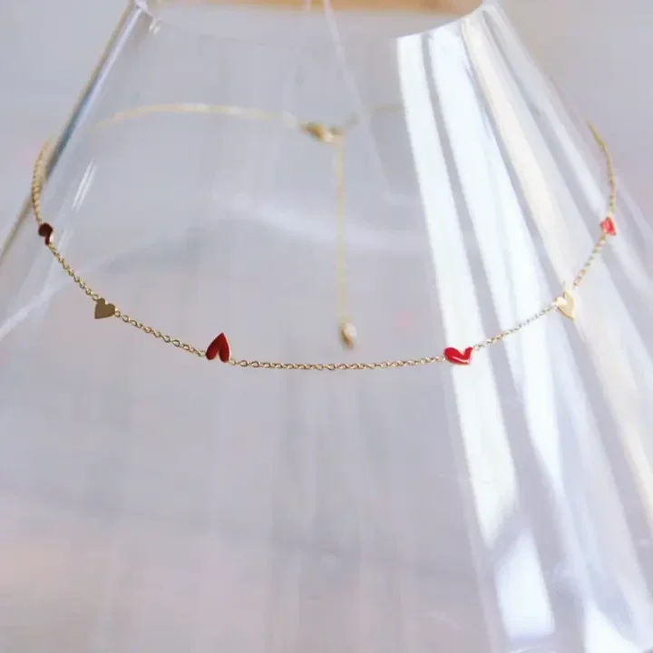 Bazou - Edelstalen fijne halsketting met rode hartjes