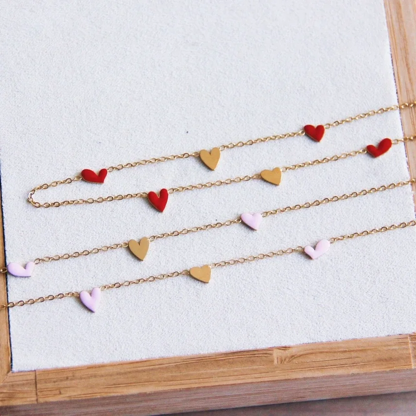 De maat van de ketting is 36 cm inclusief sluiting (+7 cm verlengketting) De kettingen zijn gevarieerd in kleur (goud en nude) en hangen op en neer Materiaal: roestvrij staal = geen verkleuring. LET OP: de hartjes van deze ketting zijn gekleurd met emaille. Het is niet verstandig om hiermee te douchen. Houd de sieraden dus droog en spuit er geen parfum op, zodat de kleur mooi blijft!