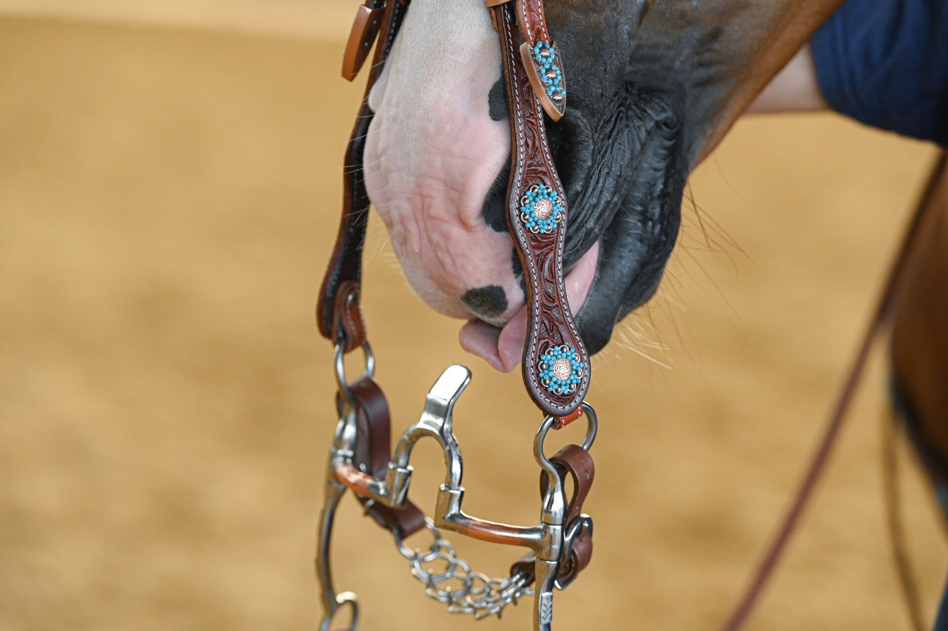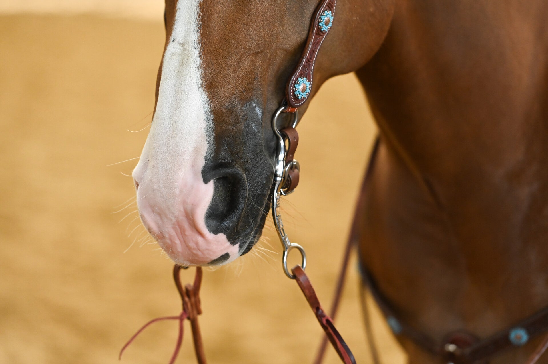 Bernard Fonck correctional bit with copper covered bars, short engraved cheeks and curb chain 10 mm.