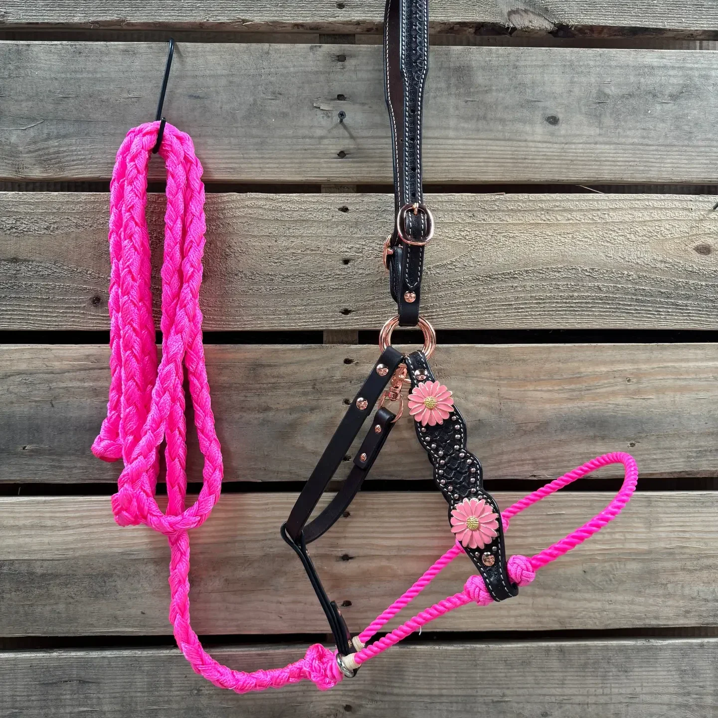 Het leer is donker olie met honingraatontwerp. Het is geaccentueerd met roze madeliefje western conchos (W228). Roze lariat neusriem met bijpassende nylon lijn van 9'. Verstelbare kroon meet 20" tot 28" van gesp tot gesp. Totale maat van wang tot wang is 7,5" Touwneusriem is in totaal 28” rond, en de knopen kunnen omhoog of omlaag worden versteld. Alle lijnen zijn afneembaar