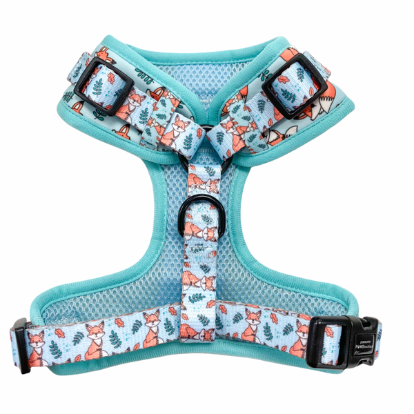 Dit super schattig aanpasbaar harnas met eigenzinnig ontwerp van foxy vosjes is gecombineerd met turquoise voering. Middenvoor op de borst zit een D-ring voor het vastmaken van ID-tags en kan ook gebruikt worden voor trainingsdoeleinden.