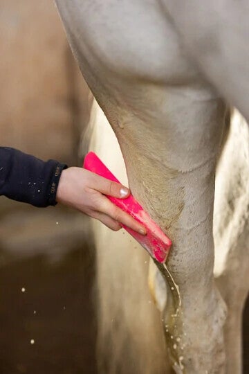 Deze handige borstel ligt namelijk zeer fijn in de hand door het formaat en het gebruikte materiaal en wordt gebruikt voor het rossen, masseren en wassen van de vacht. Het laat de vacht weer glanzen en stimuleert bovendien de bloedsomloop.