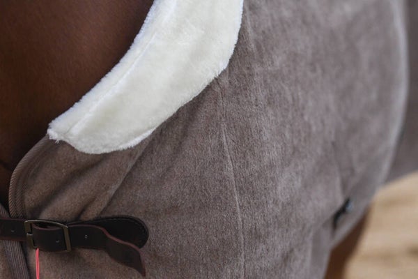 Vochtregulatie * Bovenmateriaal van teddyfleece met een zweetvoering * Hoge decoratieve nepbont hals * Twee gespsluitingen * Twee afneembare singels