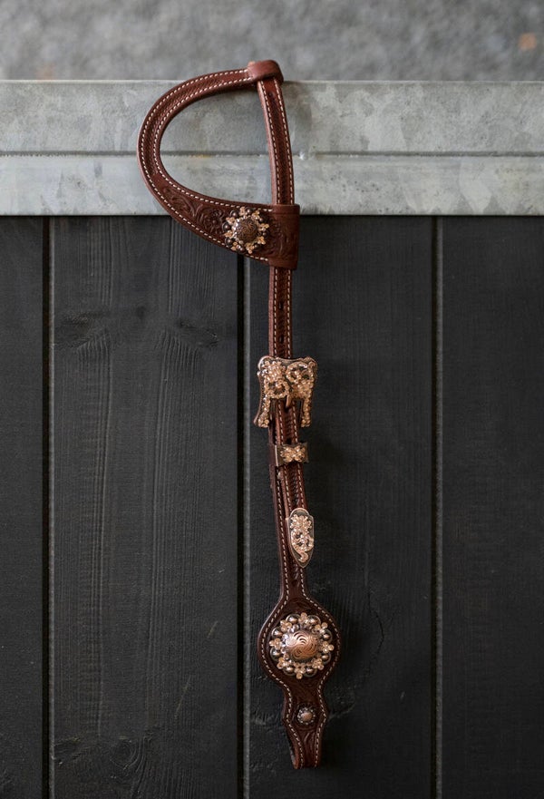 Hoofdstel Two Ear dark chestnut met peach afwerking.